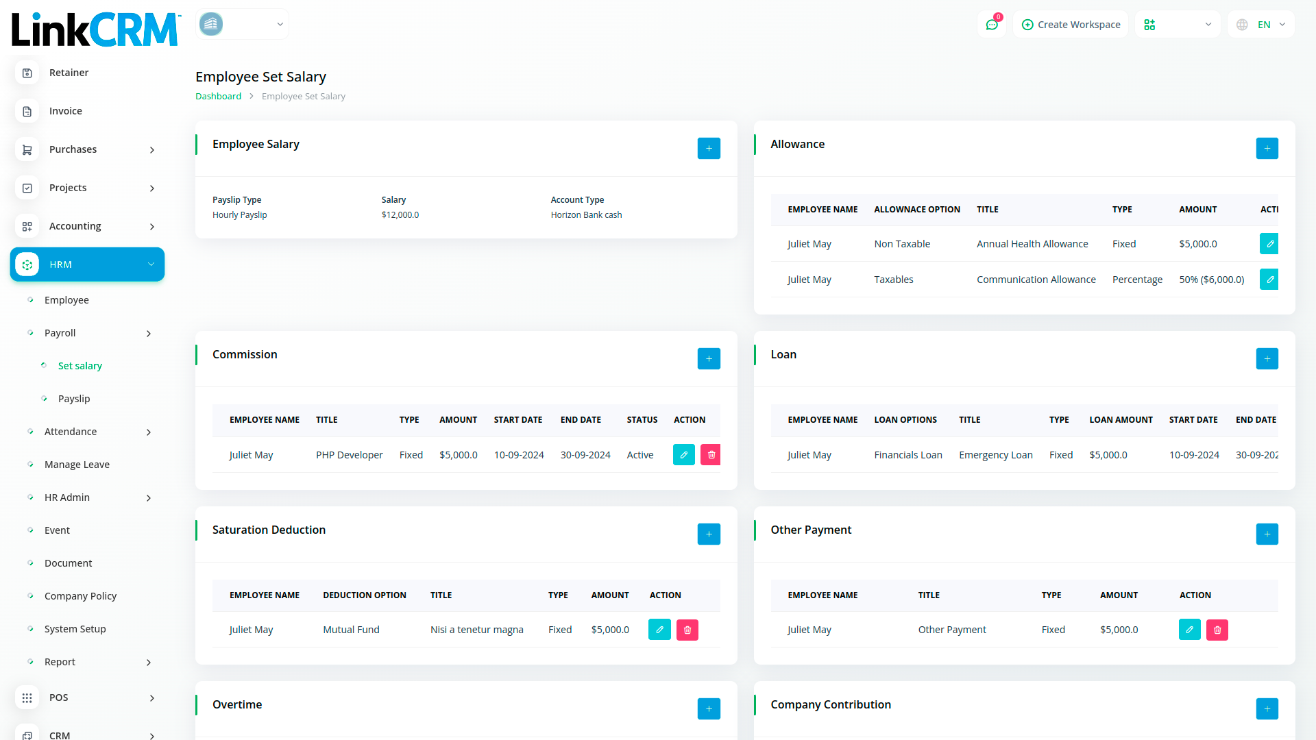 Seus funcionários são os maiores ativos do seu negócio. Não importa se você emprega 5, 50 ou 500 pessoas, com o LinkCRM Pro RH, você pode gerenciar todos os assuntos dos funcionários. Da contratação ao desempenho e salários - tudo sob o mesmo teto. Sistema HR completo personalizável, versátil e fácil de usar.